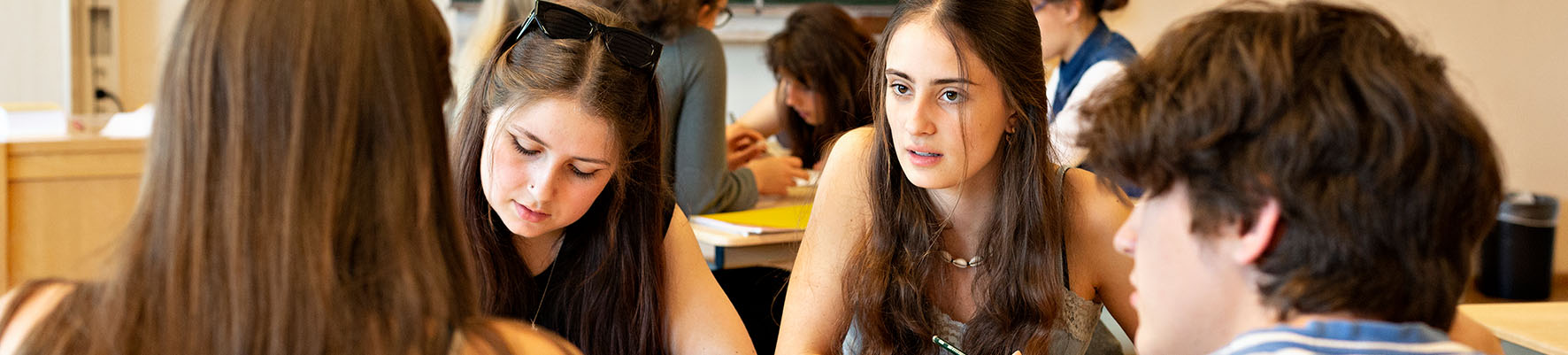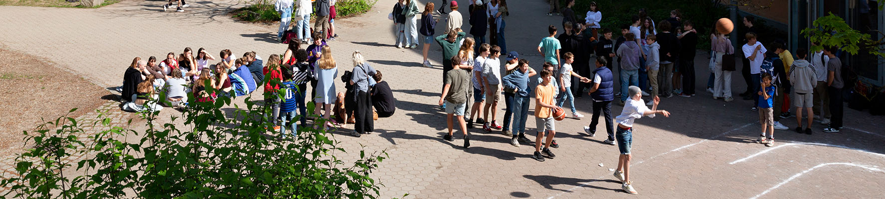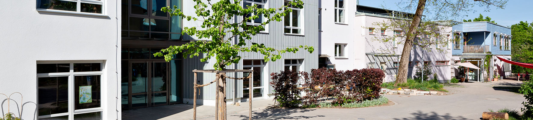 Das weitläufige Schulgelände, das in den Pausen zum Spielen, Toben und Spazieren einlädt, liegt in beinahe ländlicher Umgebung im Münchner Osten.